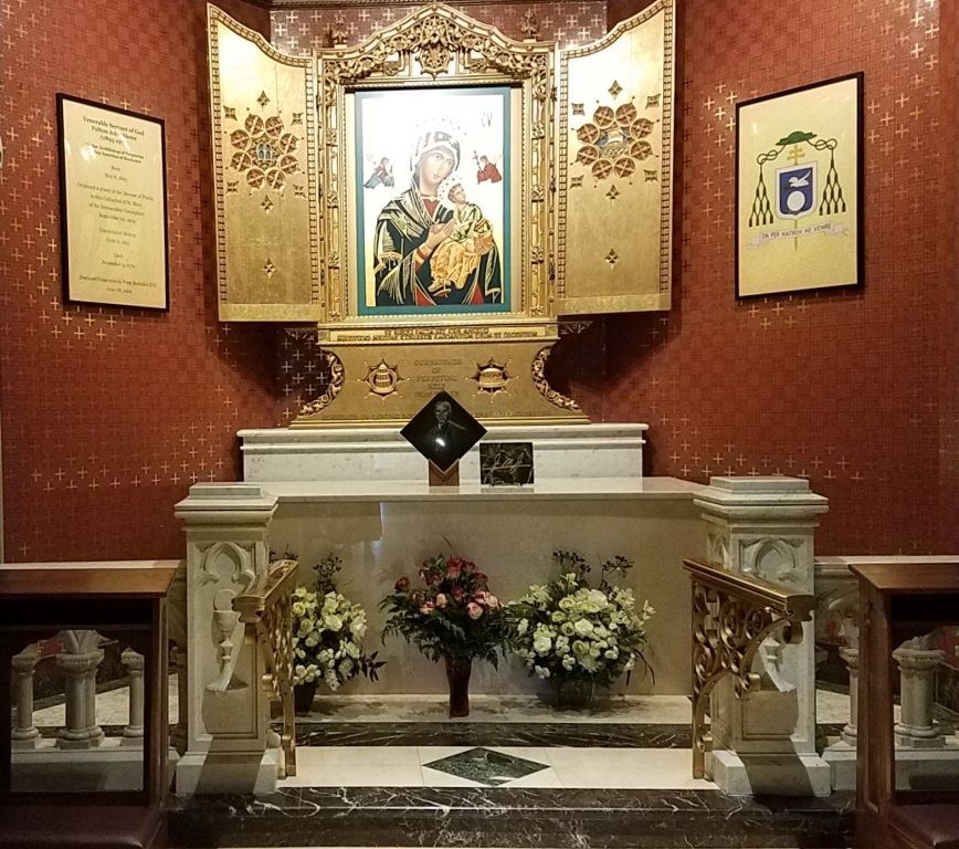 The tomb is located in the side chapel of the Cathedral. Please enter through the tomb entrance via the handicap ramp in front of the Cathedral marked “JMJ”.